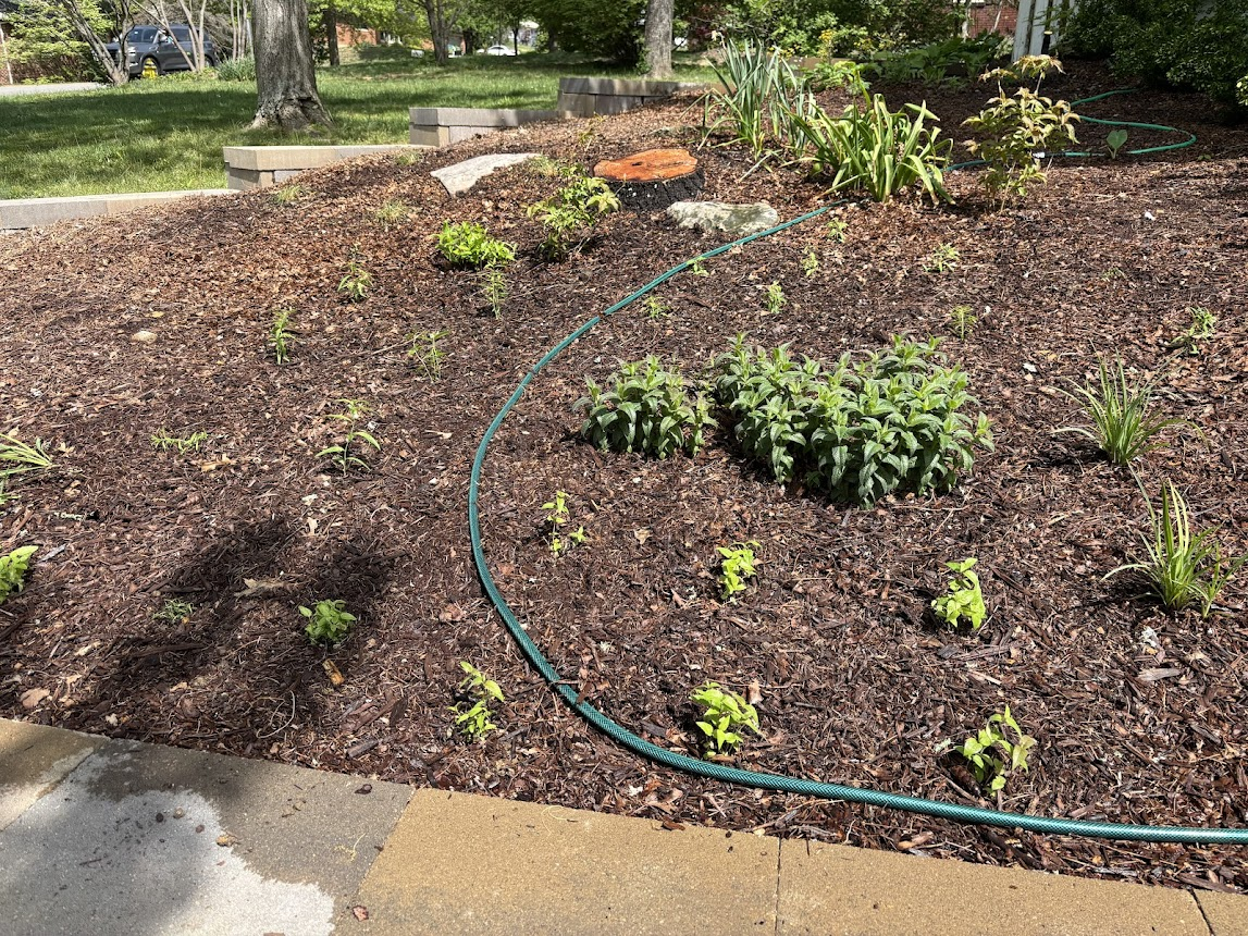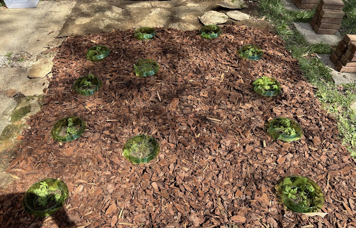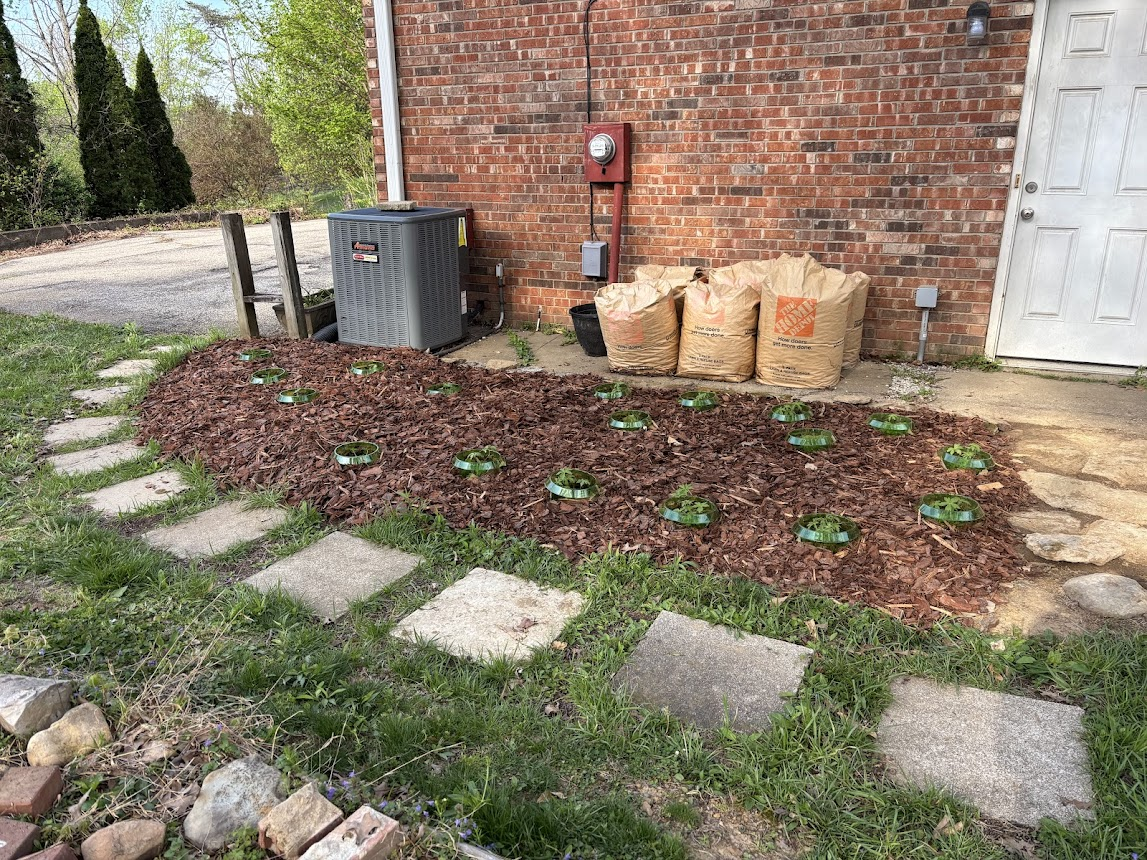 (Another lesson I learned from the things I planted in the fall of last year is that mulch will kill your plants if it shifts and falls on top of them, which is why I'm temporarily surrounding my plants with these plastic rings until they get tall enough to survive shifting mulch. I sadly lost several Cardinal Flowers [Lobelia Cardinalis] and two Black-Eyed Susans [Rudbeckia Hirta] to mulch; they didn't come back up this spring.)