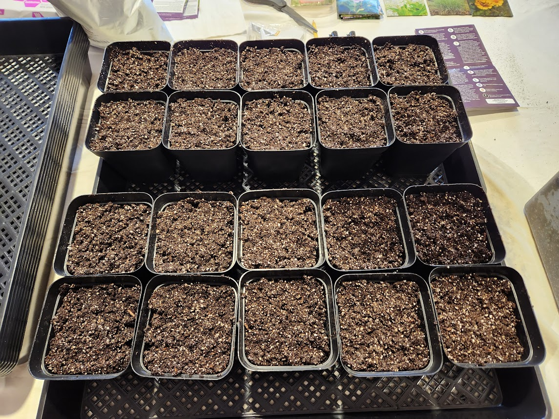 Using the sprinkle method instead of my planned four seeds per pot method, I ended up with 30 pots of seeds — three total trays.