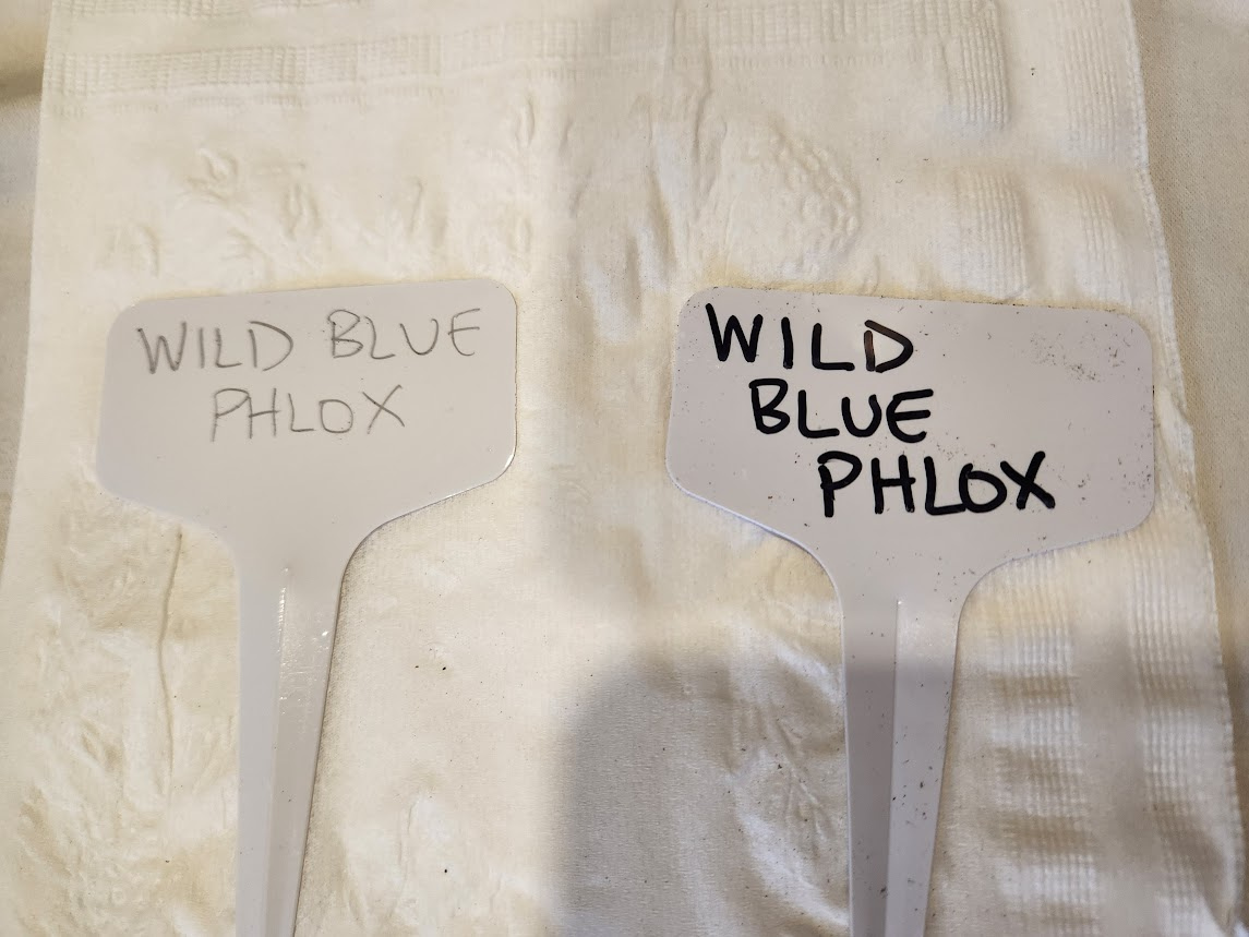 For the labels, I wrote one side in pencil on Wild Seed Project's advice and one in the gardening marker I purchased. The gardening marker side is more legible, but the pencil side will save me if Wild Seed Project is right and the marker fades while these sit outside over the winter.